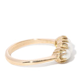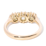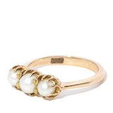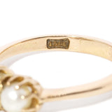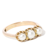 Gliding through the twilight of elegance, the 1930s Antique Ginevra Pearl Three Stone Ring glimmers with a dance of opulent light. Each lustrous pearl, cradled in 15 carat yellow gold, whispers tales of love and longing. A perfect embrace of artistry and emotion, it adorns the hand, evoking cherished memories and dreams yet to unfold, shining bright in every heartbeat.