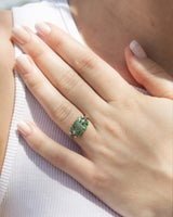 A glimmering the legacy of the 60s, the Hadleigh emerald ring tales tales of exuberance. A mesmerizing 1.5 carat emerald cradled by alluring smaller emeralds and scintillating diamonds captures light like morning dew, evoking emotions of nostalgia and romance. Her rich 16 carat yellow gold band envelops your spirit, making each moment feel special, timeless, and profoundly beautiful. Indulge in its artistry.