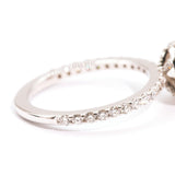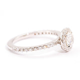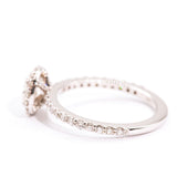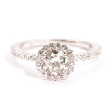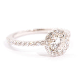 The smaller round brilliant cut diamonds in the band and halo total 0.66 carats and are of G colour and VS clarity grades.