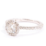Forged in 18 carat white gold, this modern halo engagement ring features an alluring 0.63 carat certified round brilliant cut diamond in the centre. The central diamond is surrounded by a glimmering halo border of round brilliant cut diamonds, and has round brilliant cut diamonds set in the band which total to 0.66 carats. We have named this stunning ring The Philamina Ring. The Philamina Engagement Ring is thoughtfully designed and carefully crafted to create an abundance of sparkle, and allows room for wedding rings and eternity rings to sit flush to the band. The Philamina Ring is just the perfect height for the central diamond to pop. This ring will be adored for a lifetime.