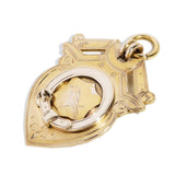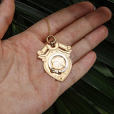 With an Edwardian history, the antique Hewitt 1899 Shield Award Pendant in 15 carat gold exudes timeless elegance. Intricate detailing frame a central shield, possibly depicting a heraldic crest. More than adornment, our Hewitt pendant is a tangible link to the past, a symbol of achievement, and a treasured heirloom waiting to be rediscovered and cherished.