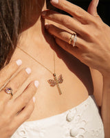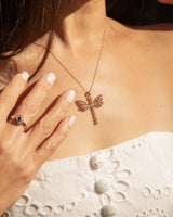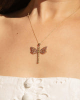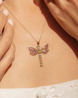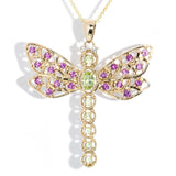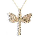 Our exquisite Jianna Dragonfly Pendant is a masterpiece of intricate design, she is nature's jewel come to life. Her delicate wings, adorned with shimmering rhodolite garnets in a vibrant hue, appear to flutter in the sunlight. Her dragonfly body, crafted from a single shimmering peridot at her centre and captivating diamonds like sparkling dewdrops, add a touch of colour and whimsy. Set in 9 carat yellow gold Jianna is a true testament to the artistry of jewellery design, capturing the beauty and grace of nature's most delicate creatures.