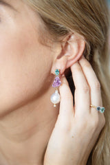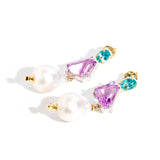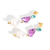 The stunning Eternal Bliss earrings feature enchanting baroque South Sea pearls, bright aqua-coloured apatite gemstones, and round brilliant cut diamonds, in 18 carat yellow gold settings and, at the centre, vivid purple kunzites in sterling silver settings.