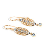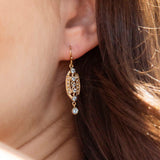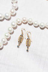 The Lola earrings have embraced the rich ornamentation of a time of fanciful celebration. Her exquisite aquamarines and white seed pearls will sparkle in the glow of the paparazzo flash, beckoning the night with dreams of stardom.
