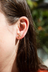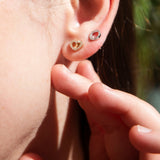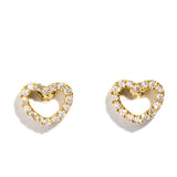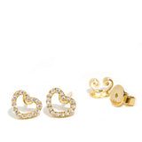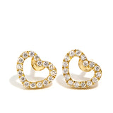 Crafted in 9 carat yellow gold, this gorgeous pair of contemporary open-pattern love heart stud earrings are embellished with a plethora of shimmering round brilliant cut diamonds. They are named The Amor Studs, "amor" meaning Love in Italian. They are perfect for cherishing meaningful memories of cherished love, beautiful as standalone jewels or stacked with other gorgeous gems and jewels.