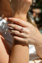 The Melina Ring belongs to our Freedom Collection. Each piece in the Freedom Collection is slow fashion at its finest. Uniquely designed and crafted with at least 95% reclaimed gems, diamonds, gold & platinum. Diamonds, gemstones and precious metals can last many lifetimes, an eternity in fact, unlike some jewellery designs. The freedom collection is ethical fashion, handcrafted from previously loved jewellery. Know that your stunning jewellery makes the lightest of footprints on our earth.