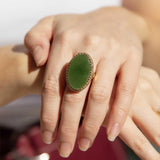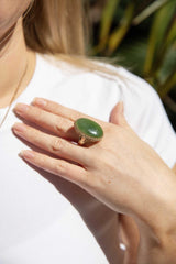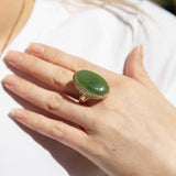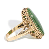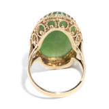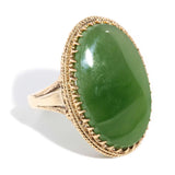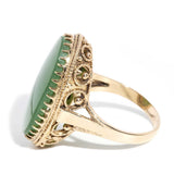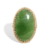 Stately and royal, Our Gwen Ring is best described in words of grandeur. Crafted in 9 carat gold, her cabochon nephrite jade sits atop an intricately decorated basket of gold. She is to be celebrated, a bold and abiding addition for the generations of your family to come.