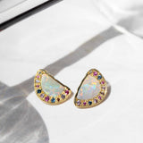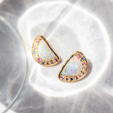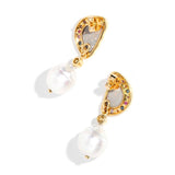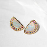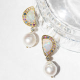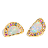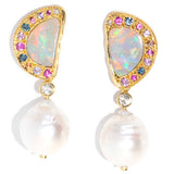 Romance borne of time and passion inspires the Amunet Earrings, a breath of captivating imagination. Each earring holds a single freeform Australian opal blazing with red, blue, and green play of colour and lovingly set within a half moon-shaped rainbow curve of pink, purple and blue sapphires. From this stunning setting, a shimmering diamond and satiny teardrop South Sea pearl, shaped of the sea's ebb and flow, sway seductively. Forged in 18 carat gold and made with a love of life, the environment, and women, she is the very image of the Imperial Jewellery ethos.
