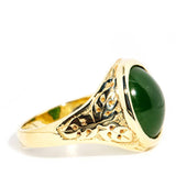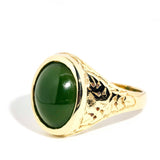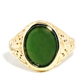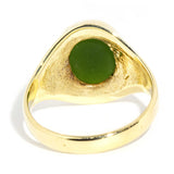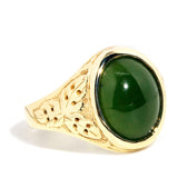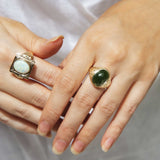 Whispers of serenity intertwine with elegance in this Logan Jade Cabochon Domed Ring, crafted in radiant 14ct yellow gold. As soft light dances across its verdant surface, it evokes tranquillity and connection to nature. Adorn your finger with this enchanting piece, where each glance inspires a moment of reflection and a gentle reminder of life's beauty.