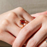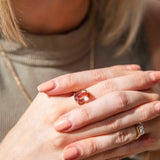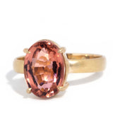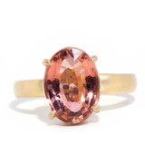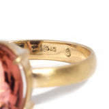 Crafted in 14 carat yellow gold with a brushed satin finish, this opulent vintage adornment is home to a gorgeous oval faceted pinkish-orange tourmaline resting in a lovely four claw basket setting. We have named this gorgeous minimalist ring The Tansy Ring. The beautiful tourmaline gemstone stands as a symbol of love, serenity, and compassion, showing undoubtedly that the most wonderful jewels are often of the simplest design. She is perfect to layer and stack with other charming gems and jewels.
