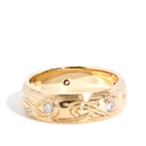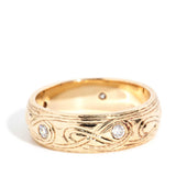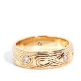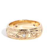 Beautifully crafted in 9 carat gold, The Rhoda Ring is perfect for vowing "To love and to hold from this day forward....". Her eternal pattern of swirling ribbon, embellished with five sparkling diamonds, will become the future story of your family's past.