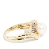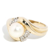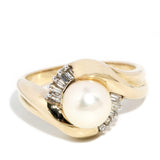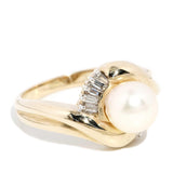 Our Xanthe Ring, beautifully crafted in 9 carat gold is a sublime jewel. Her satiny cultured pearl is wrapped in ribbons of gold with sparkling baguette diamonds that like the sun's rays burst outward.