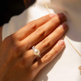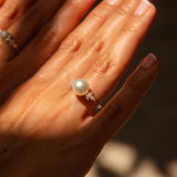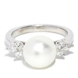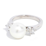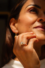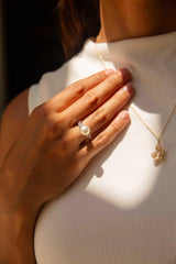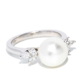 Like the gentle glimmer of moonlight on tranquil waters, the Raziah Ring captivates. Her lustrous pearl, embraced by a delicate trio of marquise-cut diamonds, add a subtle sparkle and refinement. The ring is fashioned from 18-carat white gold, emblematic of purity and grace, offering an ideal backdrop for these exquisite stones. It is breathtaking, a timeless beauty that will not fade with the years.