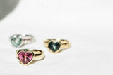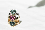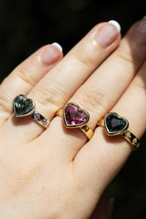 The stunning Cerys ring features a perfect pink heart cut tourmaline on a gleaming yellow gold band. Her captivating jewel is a darling symbol of newfound love and also comes in blue-green tourmaline and in aquamarine on white gold, a trilogy of undying love.