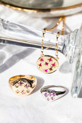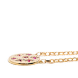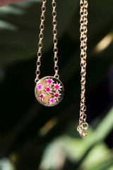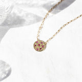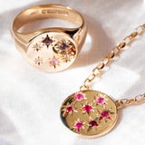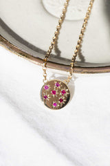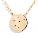 Crafted in 9 carat yellow gold, this adorable and elegantly reinvented vintage necklet features a shining disc holding seven vivid hammer set rubies and is threaded with a lovely oval link chain. Her name is Rosa, a gorgeous love letter to Mother Earth, crafted from reclaimed materials.