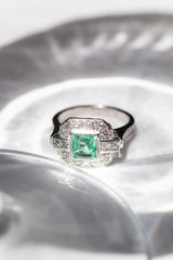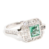 The Florence Ring contemporary platinum Art Deco style ring holds a 0.80 carat bright green square emerald with a border of round diamonds totalling 0.65 carats.