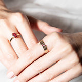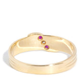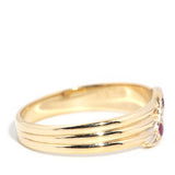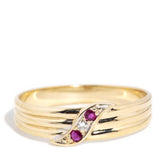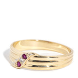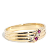 Our Min Ring is crafted in 9 carat gold and set with crimson rubies and a shimmering diamond. She is lines of simple understatement finished with a gentle flourish of curved detailing. A sweet vintage treasure to add to your collection.
