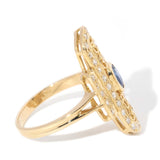 A vision of vintage elegance, the Eira Sapphire & Diamond Art Deco Inspired Ring in 18ct gold features intricate filigree adorned with sparkling diamonds. At her heart, a deep blue sapphire radiates timeless charm, evoking the glamour of a bygone era.