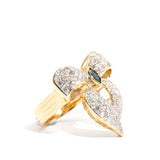 Carefully forged in 18 carat yellow gold is this ever so charming vintage bow cluster ring embellished with 0.80 carats of round brilliant cut diamonds encompassing a marquise natural blue sapphire. We have named this gorgeous vintage splendour The Bessie Ring. The Bessie Ring invokes such romance and nostalgia. The Bessie Ring is perfect fitting for the person who is as unique as this wondrous piece. The Bessie RIng is a one of a kind for the one of a kind.