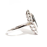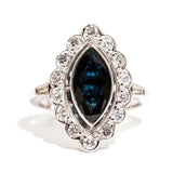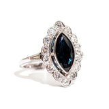 Forged in 18 carat white gold, this art deco inspired ring features a gorgeous 1.88 carat marquise natural deep blue sapphire, complemented with a border of sparkling white round brilliant cut diamonds totalling 0.76 carats. We have named this stunning ring The Noosa Ring, inspired by the beautiful blue waters of Noosa Heads in Queensland, Australia. The Noosa Ring is an understated beauty making her the perfect engagement or dress ring, she is carefully crafted and sure to become an heirloom treasure.