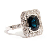 The 3.97 carat faceted cushion cut natural sapphire is of a deep blue colour. The round brilliant cut diamonds total 0.64 carats and are of G colour and VS/SI clarity grades.