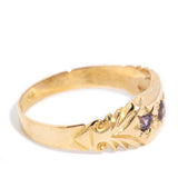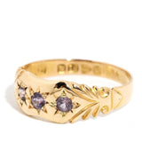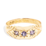 Our beautiful Aciano Ring has made her way from the early 1900's through generations of family. Lovingly crafted in 18 carat gold and embellished with three mauve-blue sapphires she is testament to an era of artistry and romanticism. For the one whose heart holds yours.