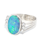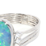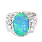 The oval opal doublet measures approximately 14.0 x 9.90 millimetres and shows strong green and blue play of colour with rolling flashes of yellow and green. The carre diamonds are estimated to weigh 0.19 carat, are F colour and VS1 clarity grade. Note: the opal surface is slightly scratched