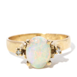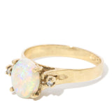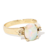 The Australian solid, crystal opal oval cabochon displays abundant flashes of orange, green, blue and yellow play of colour, and measures approximately 9x7 millimetres. The round brilliant cut diamonds are estimated to weigh 0.03 carats in total.