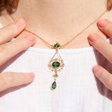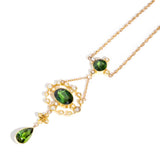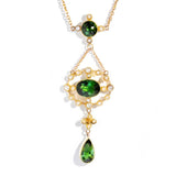 Carefully crafted in 15 carat yellow and rose gold, this elegant vintage necklet, Art Nouveau Circa 1930's, features three darling deep bright green tourmalines, each set into part of an intricate compass design interlinked by a fine gold chain and beset with cream coloured seed pearls. We have named this one-of-a-kind vintage piece The Laia Pendant. Worn comfortably on the chest, next to the heart, she is as unique as her wearer and sure to continue to a be treasured family heirloom.