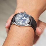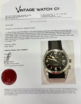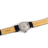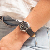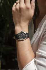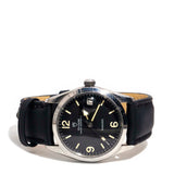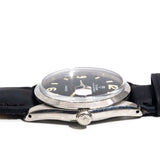 An iconic 1960 classic, the Tudor Oysterdate Ranger, reference 7966/0, with the classic ETA 2484 movement, comes in a 36 millimetre case with smooth fixed bezel, solid black dial with cream hour markers & numerals and silver-coloured hands with cream accents, making for a stylish timepiece that carries with it the balance of minimalism and confidence of the era. The Tudor Prince Oysterdate Ranger comes with an aftermarket leather strap and truly looks the part.
