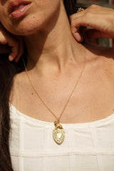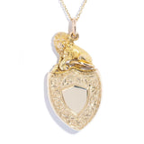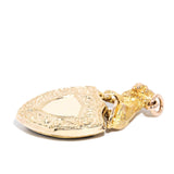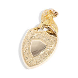 The incredible Victorian era Fallon shield Pendant with an amazing restoration story, forged in 9 carat yellow gold, features a magnificent 15 carat gold lion at her apex - a fierce protector of love and honor. On one side is a rich bloodstone shield, symbolizing courage and strength, and one the other a polished shield, symbolizing clarity and focus. An ornate hand-engraved pattern runs around the border, the perfect finishing touch to this expertly restored piece of history.