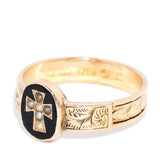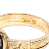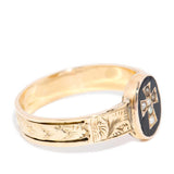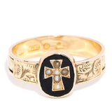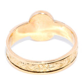 Our Aislinn Ring is a petite wonderwork, her 9 carat yellow gold band adorned with intricate engravings that mimic the delicate patterns of nature. At her heart, a cluster of tiny pearls, like satiny dewdrops, form a cross, a symbol of faith and hope. She is testament to the enduring beauty of Victorian jewelry, a timeless piece that evokes the elegance and romance of a bygone era.
