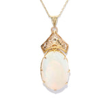 In the heart of her vintage charm, Ena cradles an 8.87 carat oval crystal opal that dances with whispered stories of yesteryear. Her 14 carat gold embrace, an ornate open pattern, speaks of artisans past weaving dreams within each delicate curve. NOTE: The chain in the photos is not included.
