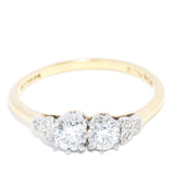 Contemporary and alluring, the Kris ring melds new stories with ancient echoes. Her twin main diamonds shimmer with a vibrance, embraced by a cocoon of warm 18 carat gold and smaller diamonds. She dances with light, a testament to new love.