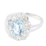 The pale blue oval cut aquamarine measures approximately 8.90x6.70x4.60 millimetres with an estimated weight of 1.51 carat. The ten round cut diamonds are estimated to total 0.80 carat with a H to K colour and SI1 to P1 clarity grade. Some diamonds display chips and minor damage, yet this does not detract from their overall visual appeal.