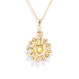 Crowned Vespera, this darling vintage pendant unfurls like a celestial blossom. Crafted by skilled hands using 18 carat gold, she holds a luminous pearl and a glittering diamond halo in her embrace, capturing the mystery of twilight skies with her radiant splendour.
