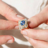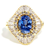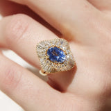 Expertly crafted in 18 carat gold The Gianna Ring is glamour steeped in fortitude. Her bold sapphire set in halos of undulating diamonds sparkles demanding our reverence. Walk confidently through your world with Gianna.