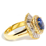 The oval Ceylon type blue sapphire is 2.23 carats and the round brilliant (H Colour, SI/P1 Clarity) and baguette (F Colour, VS Clarity) diamonds total 2.16 carats.