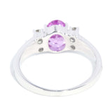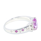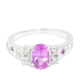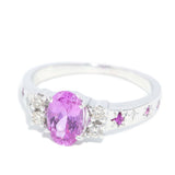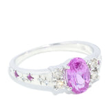 The vivid purplish-pink oval sapphire measures 8.17 x 5.31 x 3.97 millimetres. The five strong pink round cut sapphires measure approximately 1.50 - 1.60 millimetres. The ten round brilliant cut diamonds are estimated to total 0.17 carats, are I to K colour and SI to P2 clarity grade.