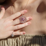 Delicately sculpted by our artisans, Rosalia blooms anew, amongst a garden of history and craft. She gleams in 9 carat gold, her petals woven of rose amethyst and pink sapphire gleam, whispering stories of rebirth, promising a dance of light and eternal grace.