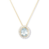 The pale blue oval cut aquamarine measures approximately 8.3 x 6.3 x 3.6 millimetres. The halo of round brilliant cut diamonds is estimated to weigh 0.30 carat, are F to G colour and SI1 to P2 clarity grades.
