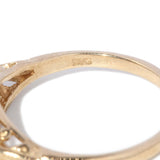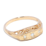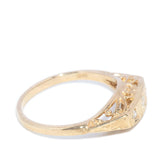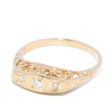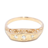 Gracie, a vintage 1980s darling kissed by time, cradles three white diamonds within her artful 9 carat gold filigree embrace. A testament to skilled hands of yesteryear, she sings a nostalgic harmony of grace, shimmering like whispered secrets under a starlit sky.