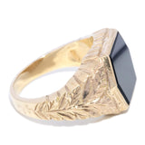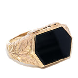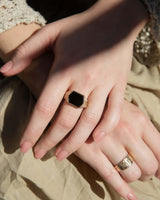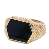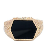 Our dear Anthony ring, with a bold hexagonal onyx resting within a leaf-like shoulder tapestry, weaves nature’s narrative in 9 carat gold geometric grace. Her deep onyx whispers ancient mysteries while she echoes harmony with each golden curve.
