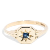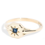 Our Dangelo Sapphire Signet Ring shimmers in 9 carat gold. Her star-shaped setting, reminiscent of a constellation, cradles a captivating sapphire, its deep blue hue evoking a starry night sky. This ring is not just an accessory, but a symbol of individuality and enchantment, a piece that will forever shine bright.