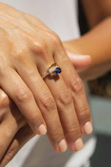 A darling bright blue tanzanite rests atop a swirling golden loop with the sweetest thread of shimmering diamonds running across the centre. The Eleni Ring is a truly sweet and whimsical beauty and sure to find a beloved place in any collection.
