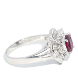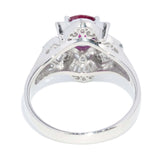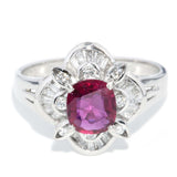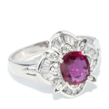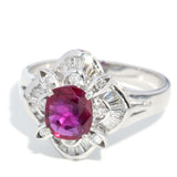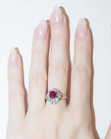 A stunning vintage jewel, Luiza enchants with her deep pink ruby, a heart of fiery passion embraced by diamond-kissed platinum, and a diamond tapestry ribboning around the edges. Like fiery love in deepest winter, she radiates an allure both bold and sustainably beautiful.