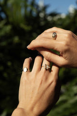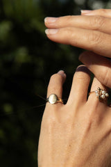 The Acadia Ring is part of our trove of strongly sustainable, environmentally friendly, and conflict-free jewellery. She lives in our carefully curated collection of one-of-a-kind vintage treasures - polished and restored with care by our talented jewellers, restoring them to their former glory.