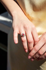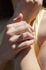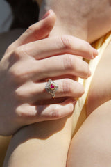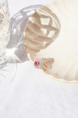 A design imagined for red carpets and Hollywood premieres, the 9 carat gold Virginia Ring is a timeless beauty. Her crimson ruby sits in lace made of gold thread and embellished with shimmering diamonds. She is ready for her close up.