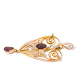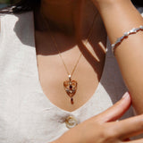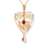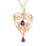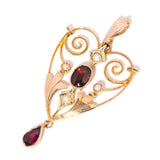 Rowyn, a resplendent openwork heart pendant adorned with a duo of deep scarlet garnets and delicate pearls, is intricately set in 9 carat rose gold, capturing the graceful essence of the Victorian era.