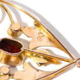 One central oval almandine garnet measures 6.00x4.00 millimetres. The dropped pear shaped rhodolite garnet measures 6.00x3.00 millimetres. The four half seed pearls measure 1.75-2.25 millimetres.